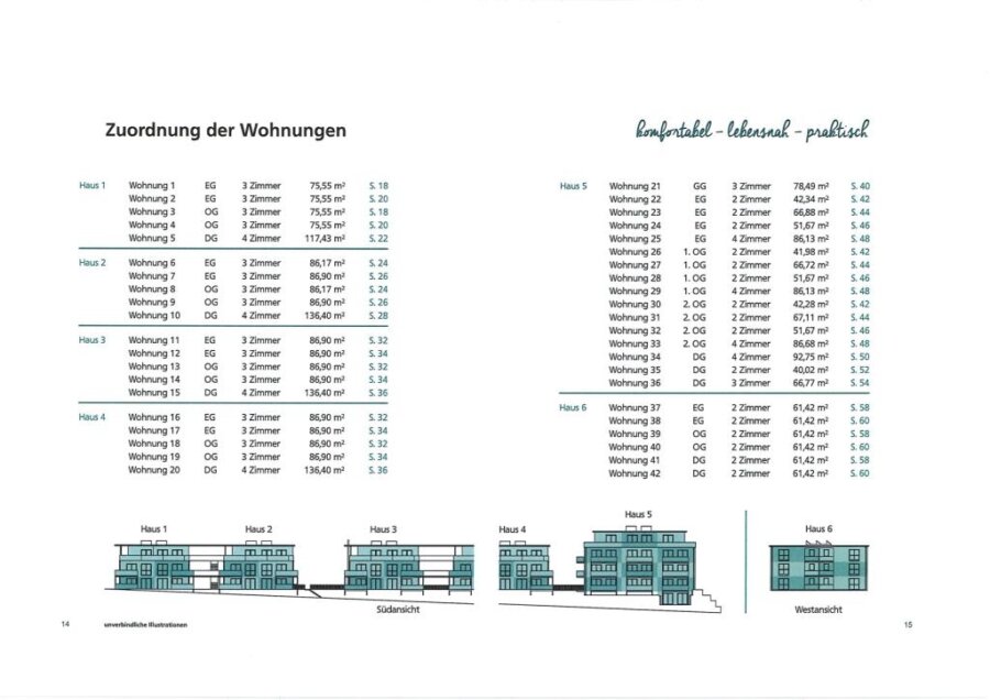 Die Wohnungen und Häuser sind nach Süden bzw. nach Westen ausgerichtet für sonnige Stunden auf den Balkonen und Terrassen.
